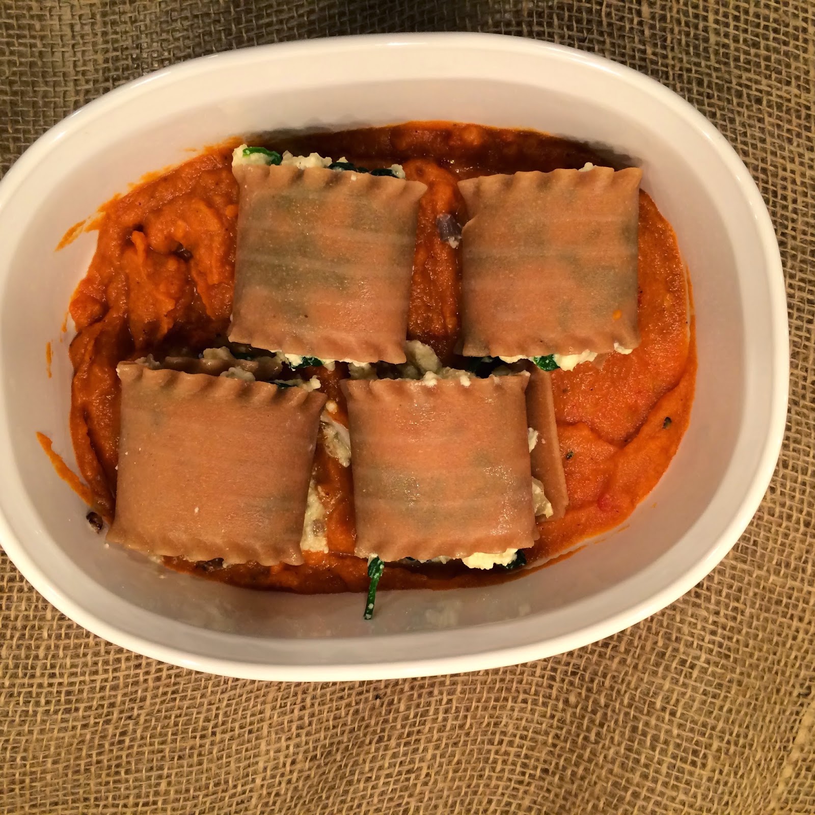 (Minced garlic: best kitchen gadget!) - In a casserole dish, spread 1 cup of butternut squash pasta sauce.